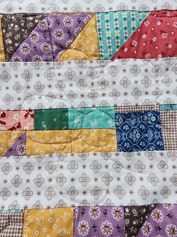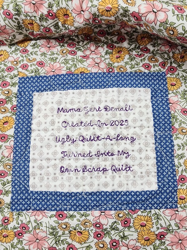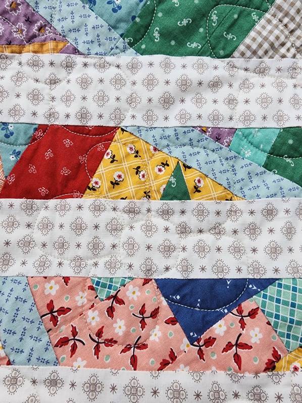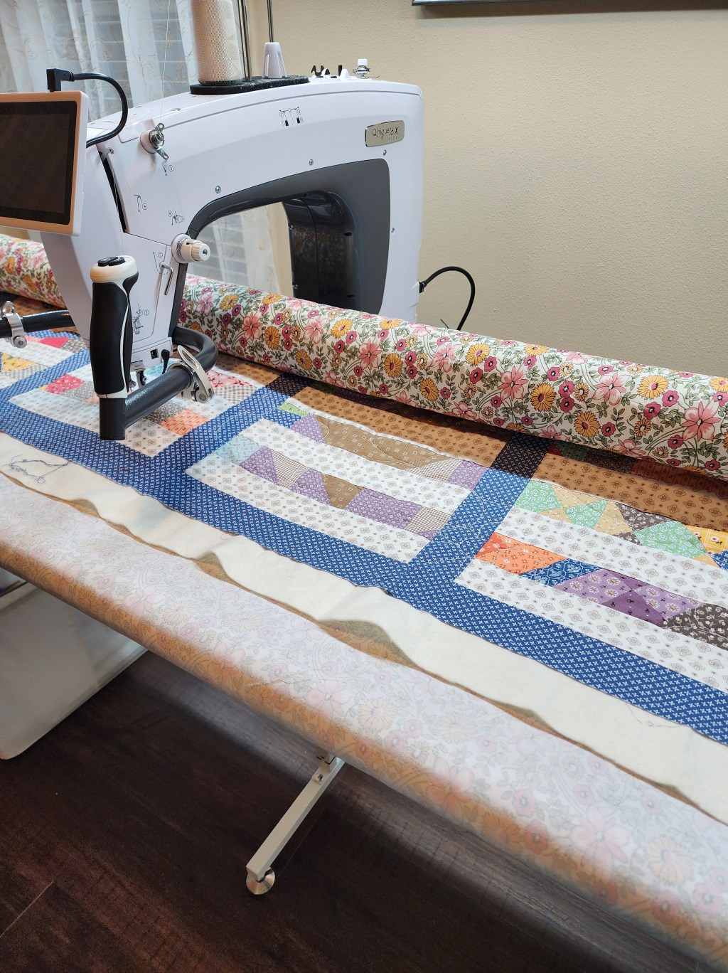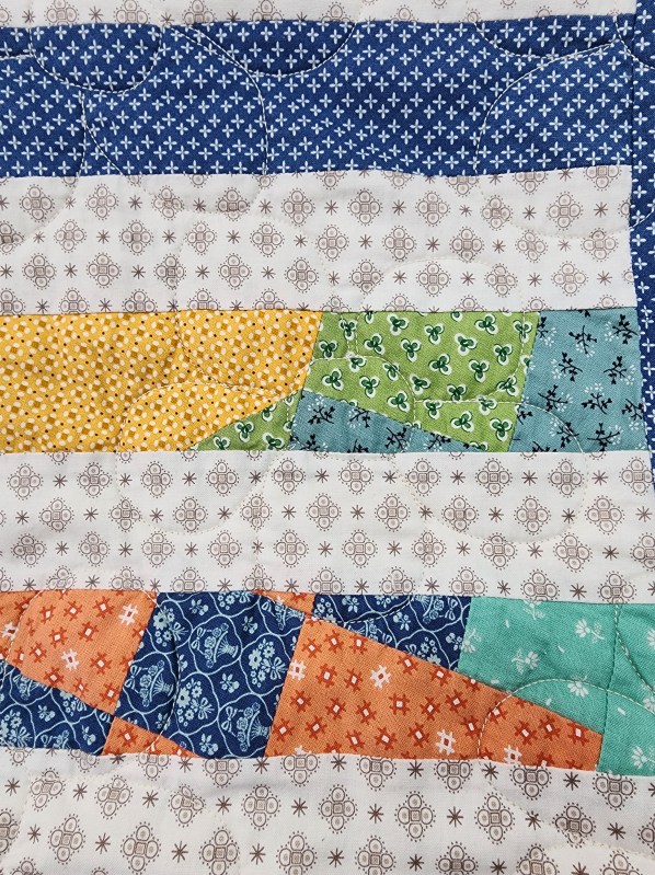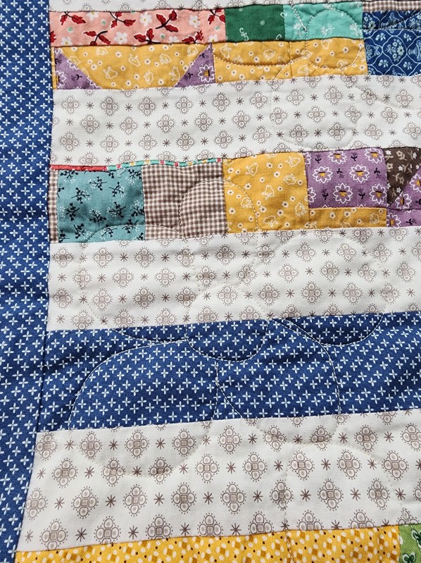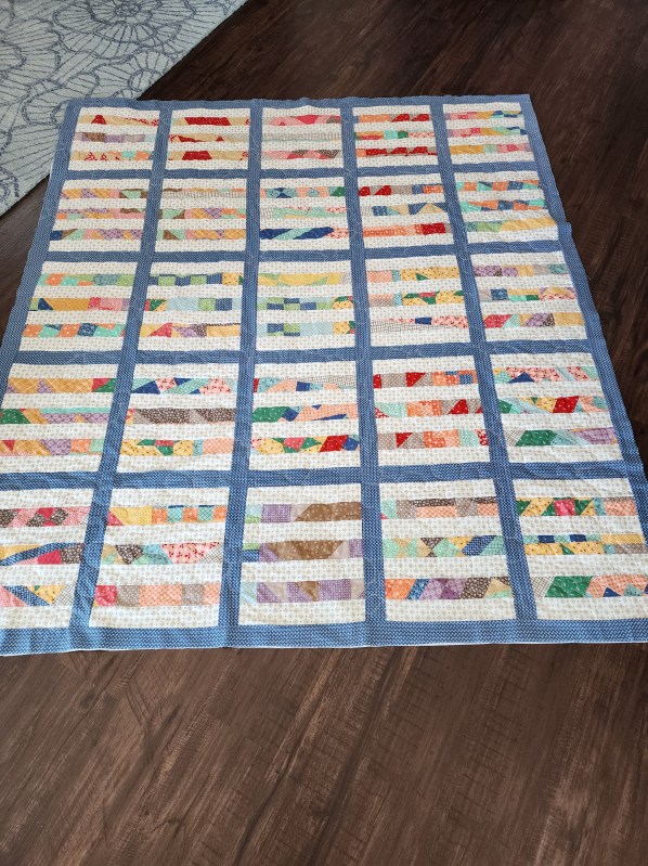 Very first ever quilt completed on a longarm machine. Images show the quilt before the border was added. Label sewn into the backing before quilting. One simple design across the entire quilt.